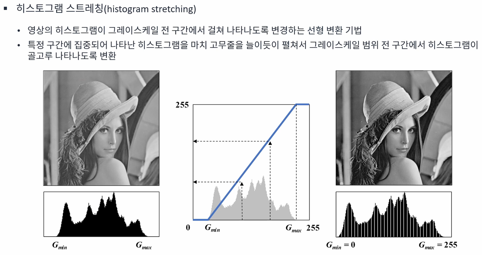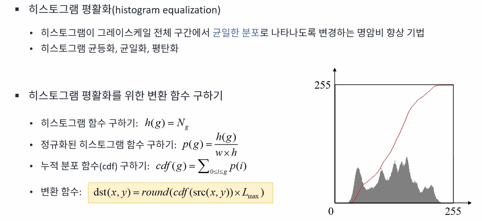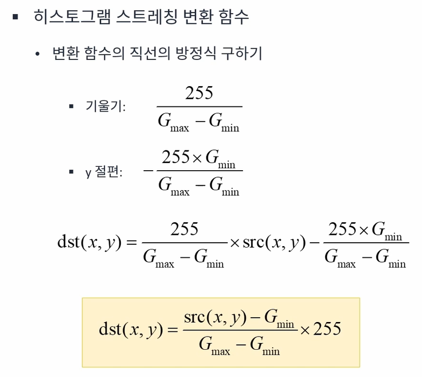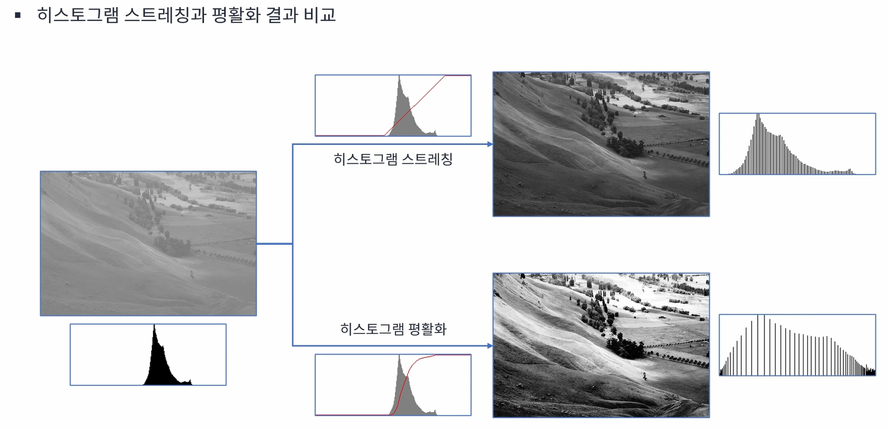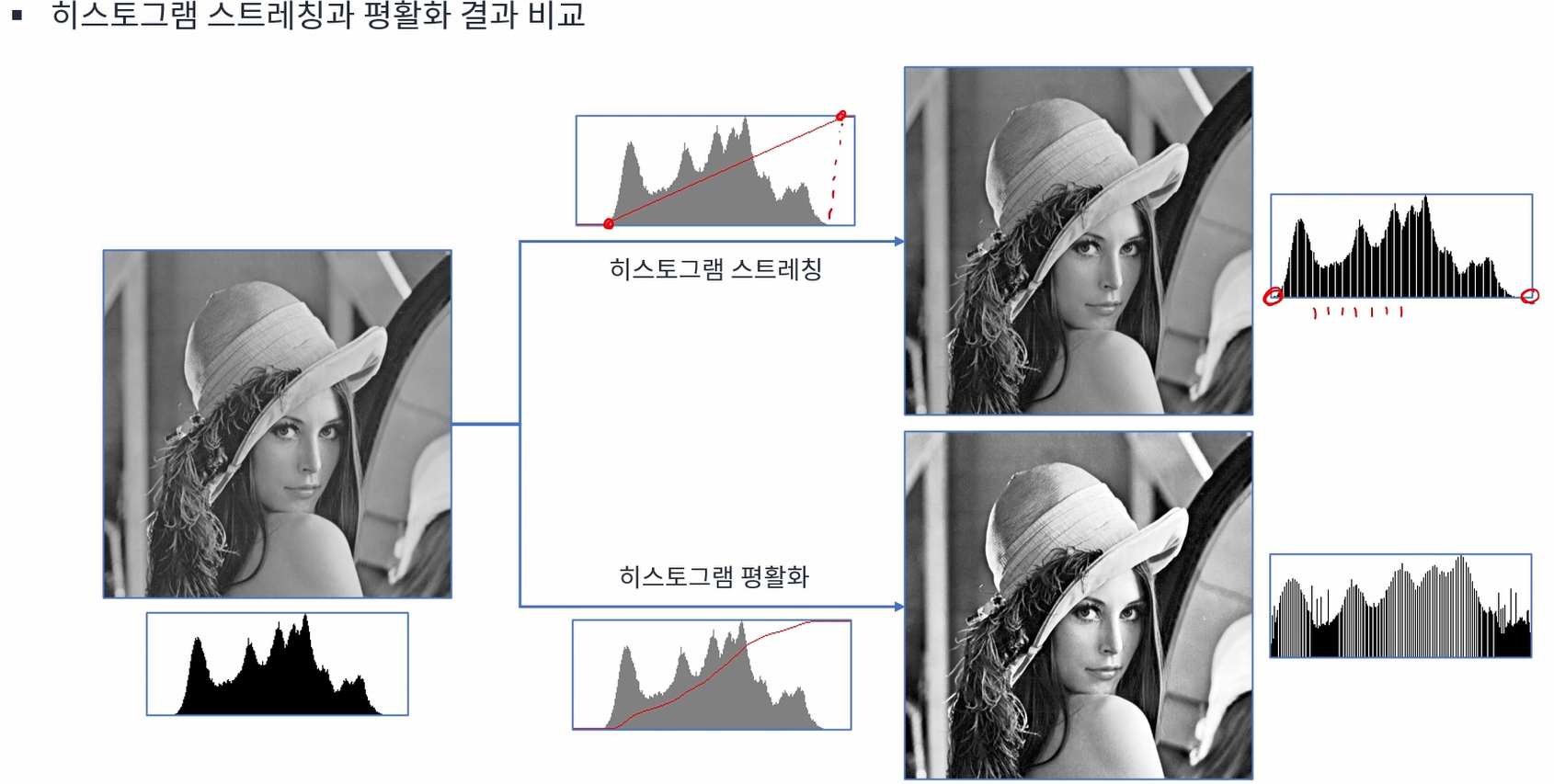 스트레칭은 일직선이지만 평활화는 누적값을 기준으로 나눈다