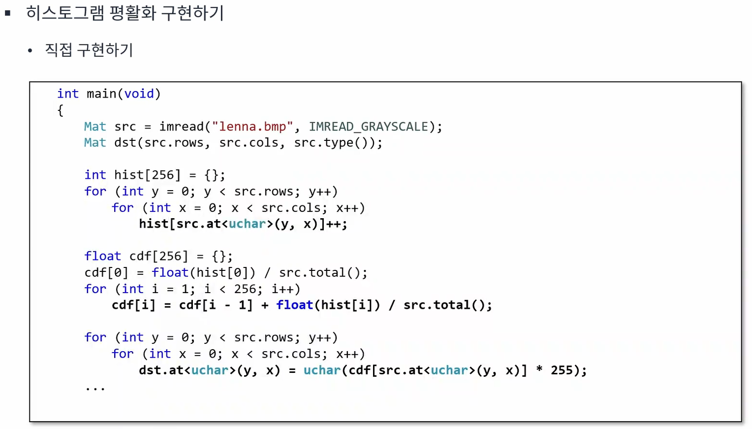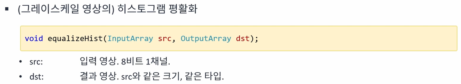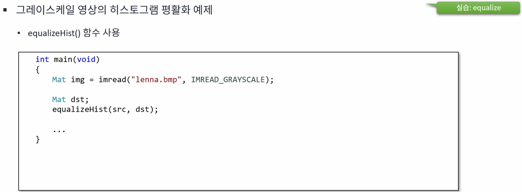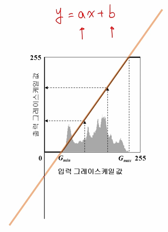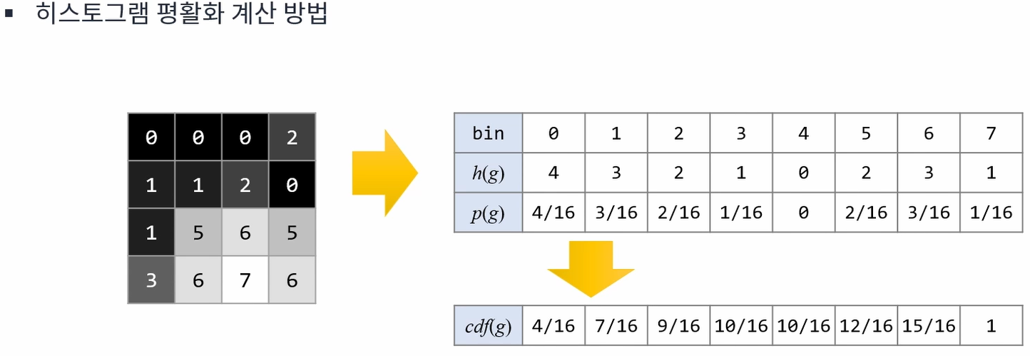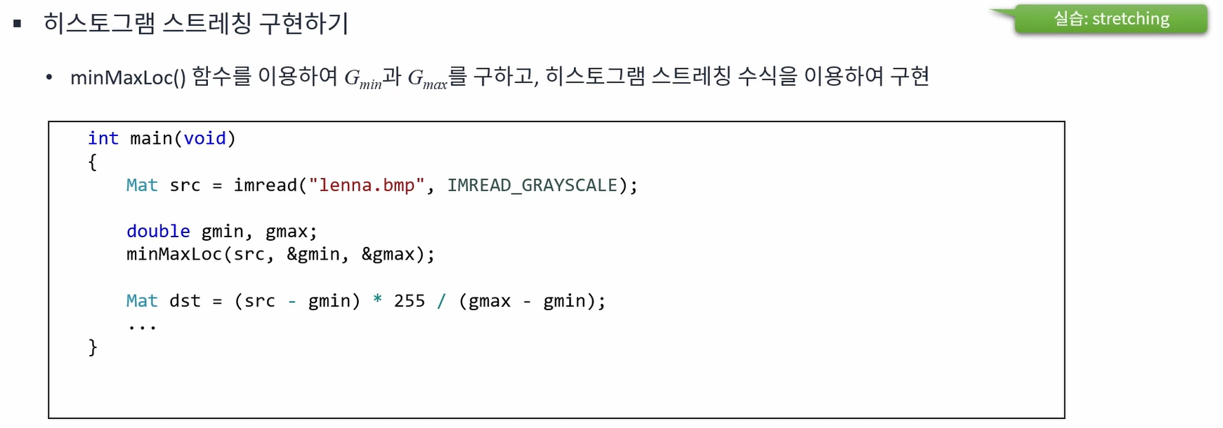 스트레칭은 일직선이지만 평활화는 누적값을 기준으로 나눈다