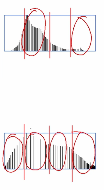 만약 구간을 나눌 경우 구간마다 분포한 히스토그램의 비율이 다르다